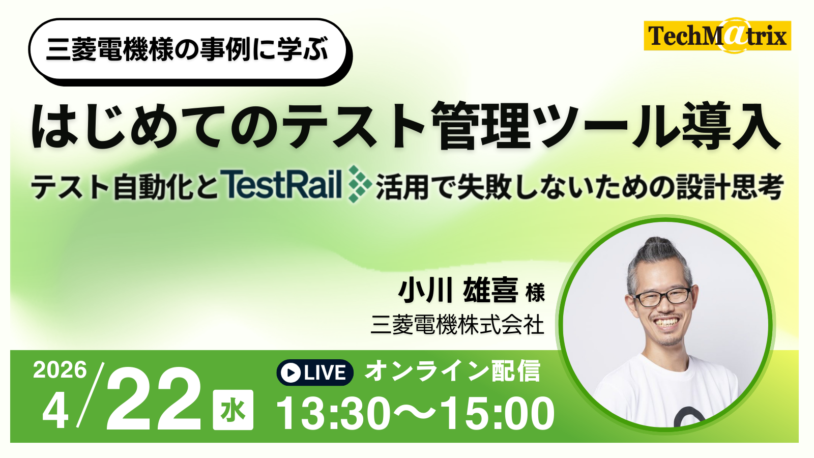 | アジェンダ | 1. API試験自動化とTestRailで実現するテスト管理改革 講演者:三菱電機株式会社 小川 雄喜様 2. テスト結果を“判断”に変える — TestRailによる品質状態の可視化 講演者:テクマトリックス株式会社 3. 質疑応答(Q&A)・クロージング ※セッションの詳細はこちらから |